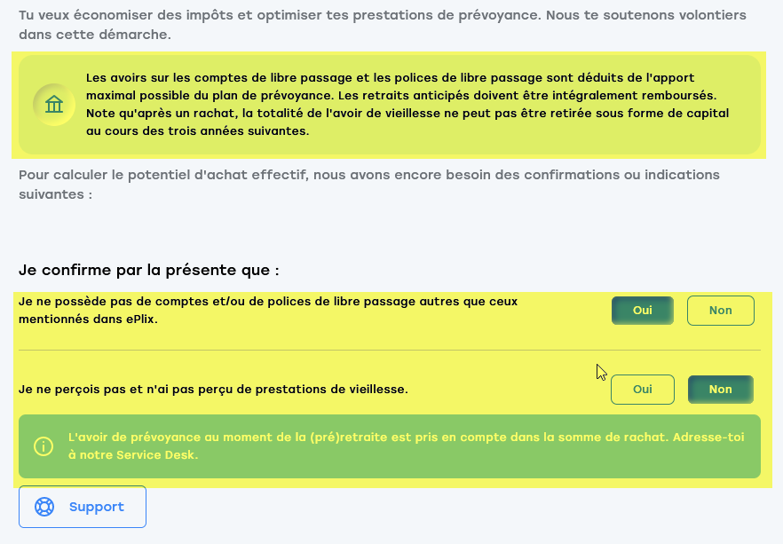 5b. Si tu ne peux pas effectuer d'achat ou si tu as besoin d'une clarification individuelle, ce message ou un message similaire apparaît : Tu peux joindre notre Servicedesk pour les demandes concernant la prévoyance professionnelle à l'adresse service@tellcopk.ch.